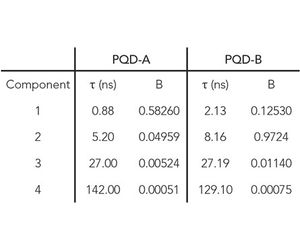 The results of the fit for PQD-A and PQD-B are shown in Table 1.The four components of the exponential fit almost certainly do not correspond to four discrete physical processes but can instead be used to calculate the average lifetime of the decay, ⟨τ⟩, which then serves a figure of merit for each quantum dot. The average lifetime of the decays was calculated using Eq. 3 and were found to be 16.1 ns and 19.1 ns for PQD-A and PQD-B respectively.