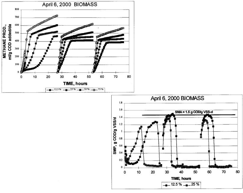 Best performance can be achieved from an anaerobic treatment plant if the operator measures the Specific Methanogenic Activity (SMA) of the biomass contained within the sludge. The SMA is measured by placing a known amount of biomass in a serum bottle, adding a known amount of substrate - usually acetic acid or ethanol — to the bottle in concentrations sufficient to cause maximum biomass activity, and measuring the resulting methane. The SMA is expressed as the COD equivalent of the methane production rate per gram of volatile solids, or gm COD/gm VSS/d. An example of an SMA measurement for a sludge removed from an anaerobic treatment process is shown in the figure below. The upper figure shows methane production measured over a three day period using a Challenge AER-200 aerobic/anaerobic respirometer. The lower figure shows the calculated specific methane production rate. The maximum specific methane production rate represents the SMA for this sludge sample. MAs between 1.0 and 2.0 indicate a highly active biomass.