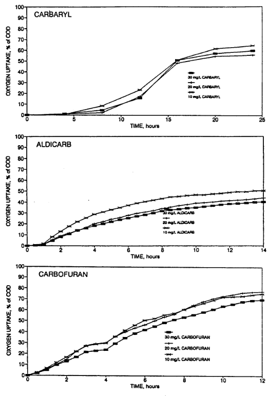 The oxygen uptake curves, corrected for dilution, show close agreement for carbaryl and carfoofuran indicating that these two pesticides were not toxic to the test microbial culture. Aldicarb was aerobically degraded but the higher oxygen uptake at low concentrations indicates the possibility of toxic effects to the test culture. The degradation of all pesticides was essentially complete as indicated by the amount of oxygen uptake as a percentage of the COD.