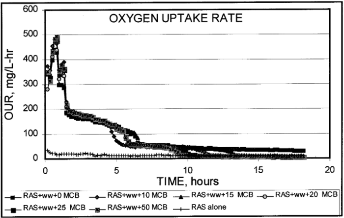 A pharmaceutical company was interested in knowing whether a specific component, MCB, inhibited the biodegradation of other wastewater constituents. A series of respirometer tests was set up using identical mixtures of wastewater and return activated sludge (RAS) plus varying amounts of MCB. The OUR fingerprint of this wastewater includes a first peak of about 500 mg/L-hr within the first hour of contact that represents the oxidation of highly-biodegradable organic constituents. A second group of readily biodegradable constituents caused a second high OUR peak between one and two hours.