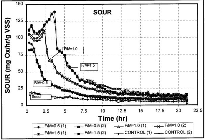 In this case, the wastewater and biomass concentrations were varied to give food-to-microorganism (F/M) ratios of 0.5:1, 1:1, and 1.5:1. Test temperature was 35°C. Specific oxygen uptake rate (SOUR = OUR/M) curves show a high rate of oxidation of readily biodegradable organic constituents. One peak occurs within one hour of test initiation. A second peak occurs between one and four hours of contact for the 1:1 and 1.5:1 F/M ratios. This reaction occurs at the low F/M test conditions but is superimposed on the first high-rate peak of oxygen uptake. At the higher F/M ratios, insufficient organisms are present initially to oxidize the wastewater at maximum rates but grow rapidly to complete the OUR reactions within four hours. The oxidation of readily biodegradable organic constituents is followed by a long tail of slowly degrading constituents. In this case, the SOUR curve for the 0.5:1 F/M ratio represents the basic fingerprint for this plant. The SOUR curves for the 1:1 and 1.5:1 F/M ratio indicate that the activated sludge process would require several hours more contact time to allow complete oxidation of the organic constituents of the wastewater. The fact that the OUR does not reach endogenous rates after 20 hours of contact indicates that the oxidation of organic wastewater constituents had not been completed.