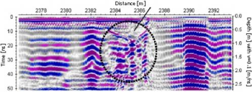 Washing out and solution processes or insufficient sediment consolidation can lead to sudden or long-term subsidence of the subsoil. Georadar is a suitable geophysical method to investigate the shallow surface up to several meters. The measurement principle is based on reflection of electromagnetic waves caused by interfaces or anomalies in the subsurface.