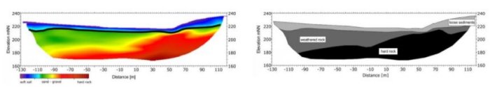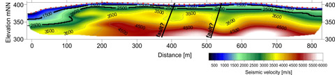 Fault zones: Geological faults are related to an increase in weathering and loosening up of the surrounding rock, which causes an increase in hydraulic routing. This lowers the rigidity of the rock and increases the risk for constructing new buildings. In the event of an earthquake, even dislocations are possible along the fault. Seismic refraction measurements enable the mapping of seismic velocities and related material properties. The lateral variations of these velocities then indicate the location of fault zones.