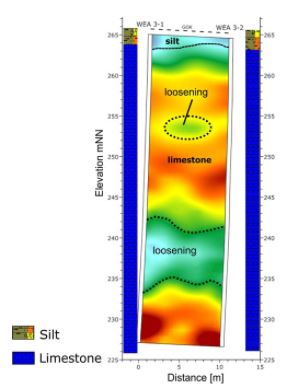 The near surface conditions at three planned wind turbine sites, which were located in an area of leachable karst formation, were investigated. As filled and collapsed cavities were expected, a tomography survey was supposed to conduct between two boreholes. The resulting tomogram enabled the delineation of significantly low velocity zones, which indicate a disaggregation or loosening of the rock.