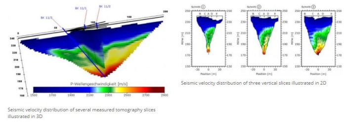 High resolution seismic tomography is a well suited method to conduct a detailed geological exploration in a complex and highly varying environment. Tomography is used complementary to drilling boreholes, as the informative value of drilling often does not extend much further than the borehole itself.