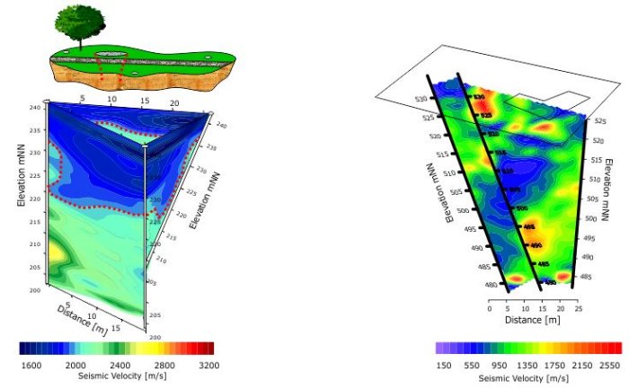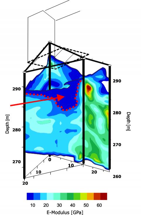 Two different examples show high-resolution tomographic studies using geophysical instruments which were placed in vertical and inclined boreholes. The results of the investigations can be seen in the adjacent images. Loose areas are characterized by low seismic velocities. The red dashed line in the tomogram indicates geologically induced subsidence. The other tomogram shows an ancient and poorly backfilled shaft (blue colours).