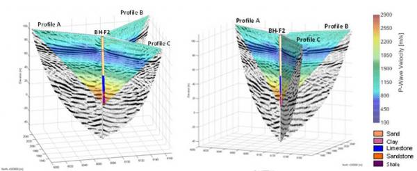 A detailed investigation of the geological conditions below buildings is limited if only drillings are used. Therefore, seismic tomography is applied between the prepared boreholes to measure the seismic velocity which provides information about the rock strength. The measurement example shows the seismic tomogram with a sinkhole structure at the surface.