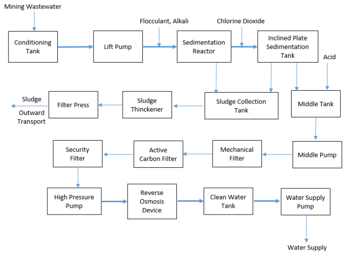 A great deal of waste water is discharged in the process of mining, but 40% of mine areas in China are seriously short of water, which has restricted the development of mining enterprises` production. Mining area in the northwest is mostly in mountainous areas, and water resources are scarcer. Surface water is mainly intermittent river. The dilution capacity of flow is poor all year round. The wastewater discharged into the river causes pollution. A large amount of mine waste water from mining enterprises is discharged into nearby rivers, which pollutes surface water and groundwater with heavy metals in the waste water. The water quality and the utilization rate both decrease. However, the treatment efficiency of the above waste water is low, and most of it is not utilized, resulting in a large amount of waste water.
