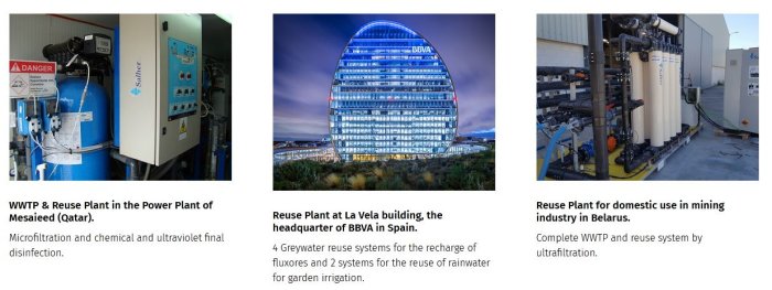 Filtration and ultrafiltration technologies allow irrigation of gardens and green areas with reuse water, as well as sprinkler irrigation or the recharge of toilet tanks.