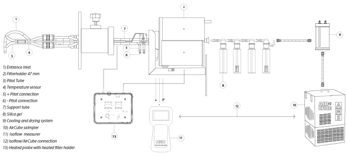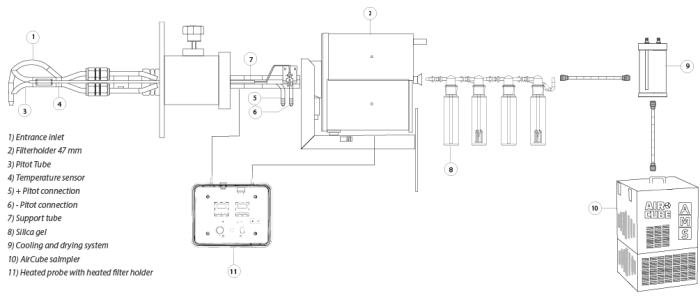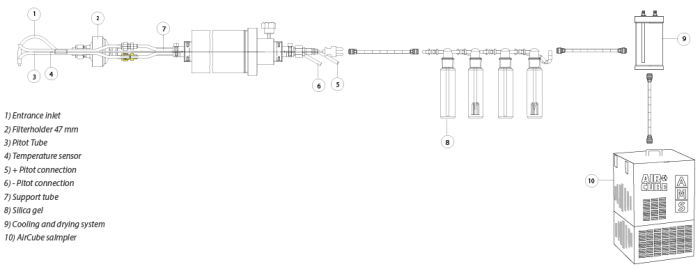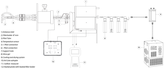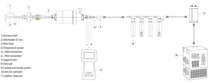 The manual sampling can be performed with every AirCube™ model in the series, combining with IsoFlow 201 Pro isokinetic parameters calculator. The isokinetic automatic sampling is compliant with ISO-9096 and ISO-10780 standards and it will be performed with AirCube™ COM2 ISO and AirCube™ HE ISO models. Alternatively AirCube™ Com 2 and HE samplers may be directly interfaced with IsoFlow 201 Pro measurer.