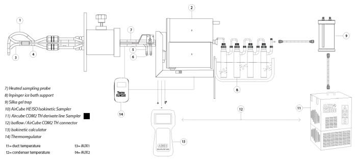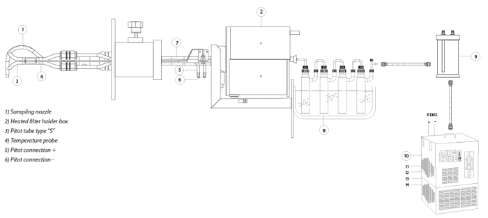 Device does not concern isokintetic sampling mode in real time. The filter holder must have a heated tank (extractor sensor is the same as the isokintetic option) and linked directly to the bubblers attached at the output, three of them with sintered baffle containing a solution adsorption and an empty impinger without baffle. Due to lower gas concentrations and environmental limits, sampling time might be extended.