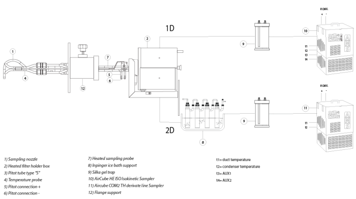 The norm foresees two different sampling methods, the first one consist of direct gas passage in both supports in the same suction flux, the second one with a derived flow.