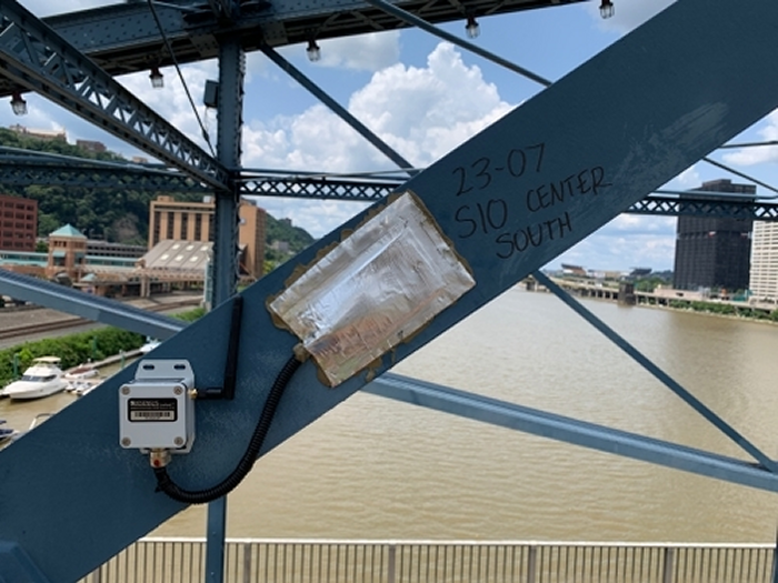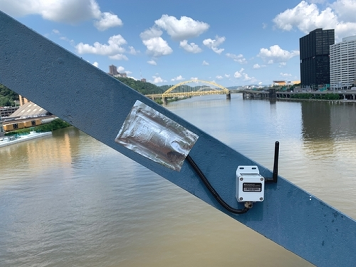 Wireless Strain Gauge SenSpot™:Continuously monitor and report strain in load bearing members; once baseline reading is established, the maximum strain produced by legal loads is found using controlled test trucks. The estimated strain on load bearing members by the legal loads will be used as the threshold to screen for overweight loads and to detect potential load rating violations.