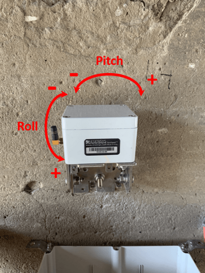Wireless Dual-Axis Inclinometer (Tiltmeter) SenSpotTM installed on a face of a retaining wall and its movement and sign conventions (Roll: tilting of the wall in longitudinal direction & Pitch: tilting of the wall in transverse direction)