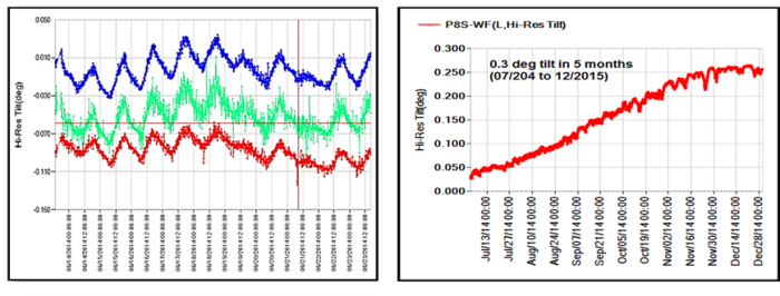 - Left: healthy tilt pattern on three piers, small variation (about 0.01degrees per day) caused by temperature.