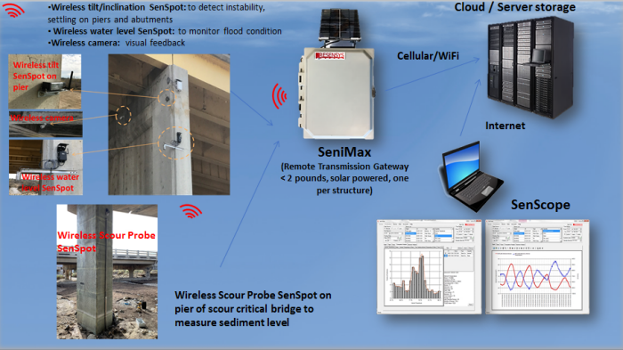 Wireless SenSpot™ Sensors and Devices: are attached to the scour critical prone members of a structure. The number of gauges required per structure is usually dependent upon the design, existing issues on members and scour critical bridge monitoring needs.