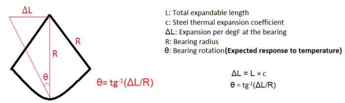 Technical Note: Functionality of the bearings rotation and responsiveness of pier bearings are assessed by comparing measured responses rate (attained from regression analysis of Displacement/Tilt and corresponding temperature data during monitoring time period) with expected value (attained from effective length of spans and steel thermal expansion coefficient).