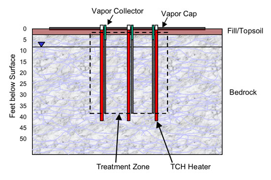 ISTD uses simple electrical heaters suspended inside steel casings installed in boreholes to deliver energy to the surrounding formation, coupled with vacuum extraction. The heat migrates away from the heater borings by a combination of thermal conduction (driven by a temperature gradient) and convection (migration of steam produced by boiling ground water). The fractures are major pathways for the generated vapor to escape and be captured by the vacuum extraction system. Since in a typical fractured rock application, every ISTD heater is supplied with a vapor recovery point, the entire treatment zone is kept under a vacuum, ensuring that even chlorinated volatile organic compound and oil vapors generated in dead-end fractures are captured.