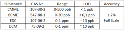 IUT Technologies IMS-Analyzer is capable of detecting and quantifying substances like these in the required ppb concentration level. The coupling of a gas chromatographic preseparation prior to the high sensitive IMS technology provides an analyzing performance, where each of the named compounds can be measured and quantified separately with outstanding sensitivity, repeatability within cycle times of minutes. by applying GC-preseparation, the unique method properties of IMS are available even in the background matrix of chemical production plants.