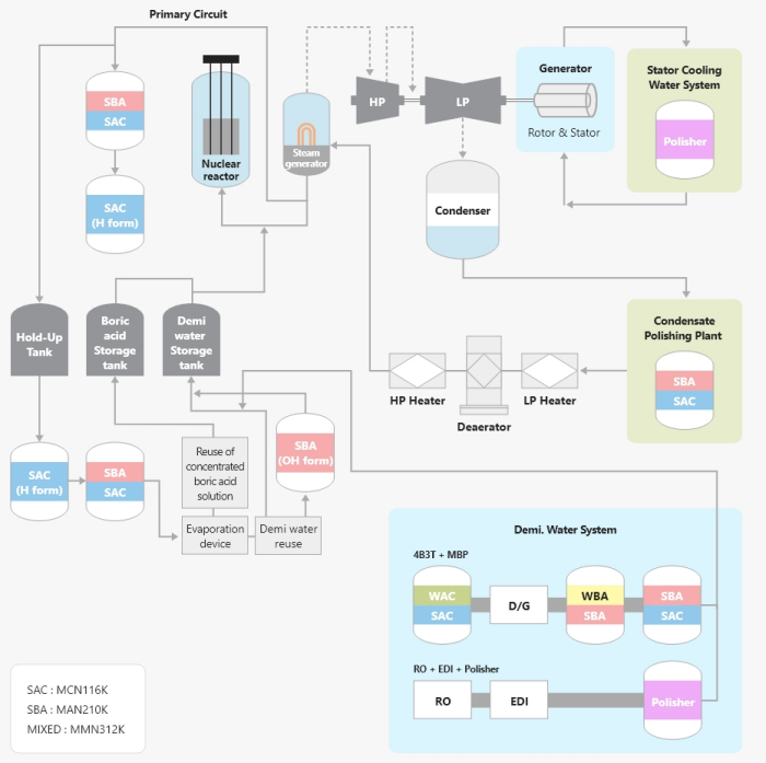 Ion exchange resins used in nuclear power plants are used in processes such as make-up systems, condensate treatment, and nuclear power plant primary circuits. The water treatment flow for PWR nuclear power plants typically consists of two stages, including the primary circuit and make-up systems, as well as the condensate treatment in the secondary circuit. The ion exchange resins used in the primary circuit must be highly cross-linked resins and have low impurity content and high physical-chemical strength, as they may be exposed to radiation. TRILITE® ion exchange resins have a diverse delivery record in domestic and international nuclear power plants and are contributing to our customers` competitive power supplies through stable quality control and timely delivery.
