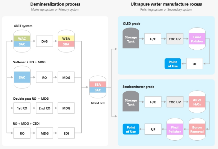 The importance of ultrapure water used in the semiconductor, OLED, LCD, and other electronics industries is increasing, and as related industries advance, the purity and reliability standards for ultrapure water are becoming even stricter. TRILITE® ion exchange resins for ultrapure water have been delivered domestically and internationally to ultrapure water facilities in the semiconductor, display (OLED, LCD) industries, and have acquired references of trust. They are contributing to improving our customers` competitiveness through stable quality control and timely delivery. TRILITE® ion exchange resins for ultrapure water are divided into URR100, UPR200, UPR300, and UPR400 series depending on the required ultrapure water quality.