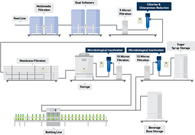 UV is highly effective at inactivating microorganisms* which has been proven in industrial installations around the world. There are multiple locations throughout a food and beverage facility where UV can be installed to treat microorganisms. Some typical locations would be; points-of-fill, points-of-rinse, post-carbon filter, pre-membrane filtration or reverse osmosis, post-water, and pre-syrup storage tanks.