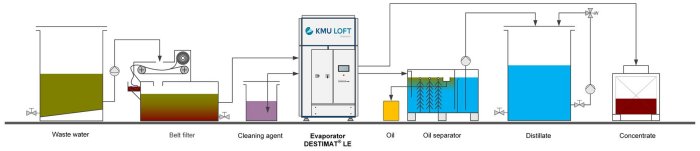 - In the pre-treatment step, solids are separated out, amounts of fluoride and similar substances are minimised, ammonium is removed, the water is neutralised. During evaporation, the KMU LOFT vacuum evaporator processes the pretreated wastewater to produce a high-quality condensate (distillate).