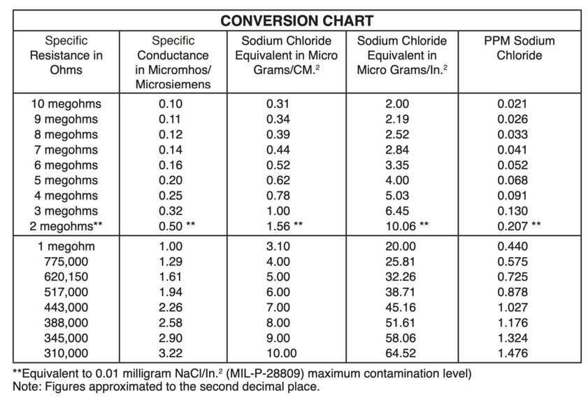 The level of cleanliness needed or desired can only be determined by each individual company. Mil Spec P-28809 can be used as a guideline, or standards can be established based upon available data. In either event, the comparative method using the Myron L® Company’s Ultrameter will assist in the determination of that level of cleanliness.