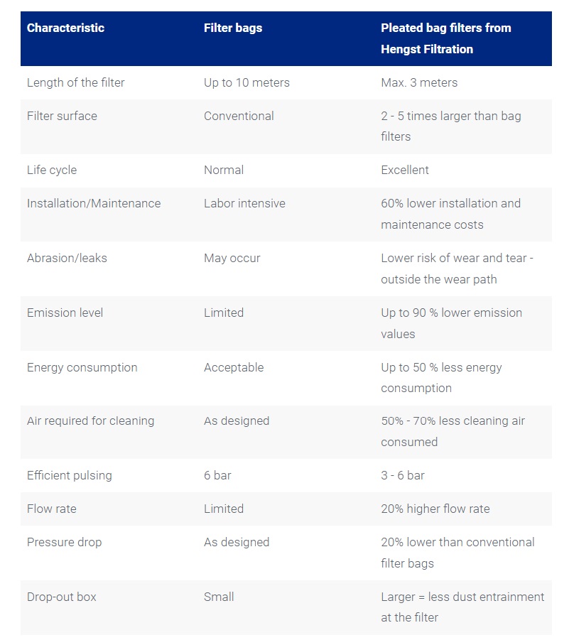 In many cases, pleated filter bags are shorter and have a larger filter area (see illustration below), while providing the same or higher performance. This can result in longer life, lower energy consumption and higher capacity.
