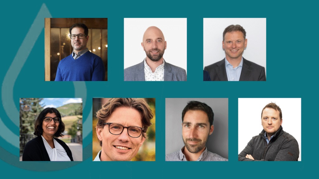 Our distinguished panelists (clockwise from Top Left): Jose Porro (Cobalt Water), Adam Tank (Transcend Software), Martijn van Noordennen (Desolenator), Sean Mulligan (Vortech Water Solutions, Ltd), Loic Croissant (Purecontrol), Tico Michels (Brabant Water), Reshmina William (Lead for the US Utilities Trial Reservoir).