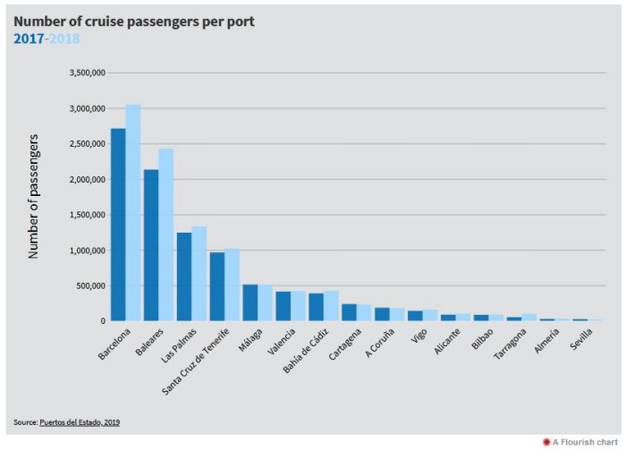 The graph below shows the fifteen Spanish ports with the highest number of cruise passengers during 2017 and 2018 (2):