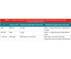 Manufacturing DUV- and EUV-compatible optics and opto-mechanical assemblies requires a level of environmental control far beyond that of traditional particulate-based cleanrooms. Depending on the wavelength and fluence (energy per area) of the UV laser, different levels of molecular contamination control are required to prevent laser damage to the optical components. The table below shows the maximum advisable levels of organic and inorganic airborne molecular contamination (AMC) in air for manufacturing medium and high fluence DUV optics. Note that EUV litho areas implement the use of wavelengths well below 100 nm within EUV tools which hold the main exposure stage at vacuum. However, the reflective optics in this area of the stage must still be free of embedded AMC-related defects that could occur during optics manufacturing, and as such optics that are used in advanced litho areas should meet the control limits of 193 nm FAs.