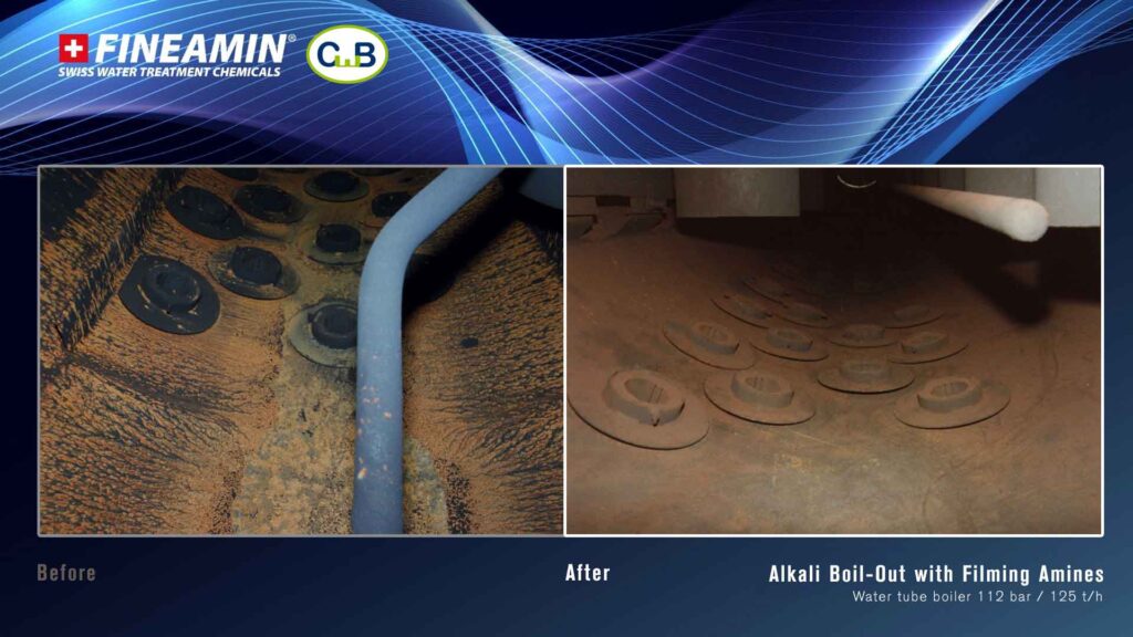 A typical alkaline boil-out may take from 12 hours to multiple days depending on boiler size, system conditions and chemicals used, but using Fineamin reduces rinsing time since cleaning and passivation happen simultaneously.