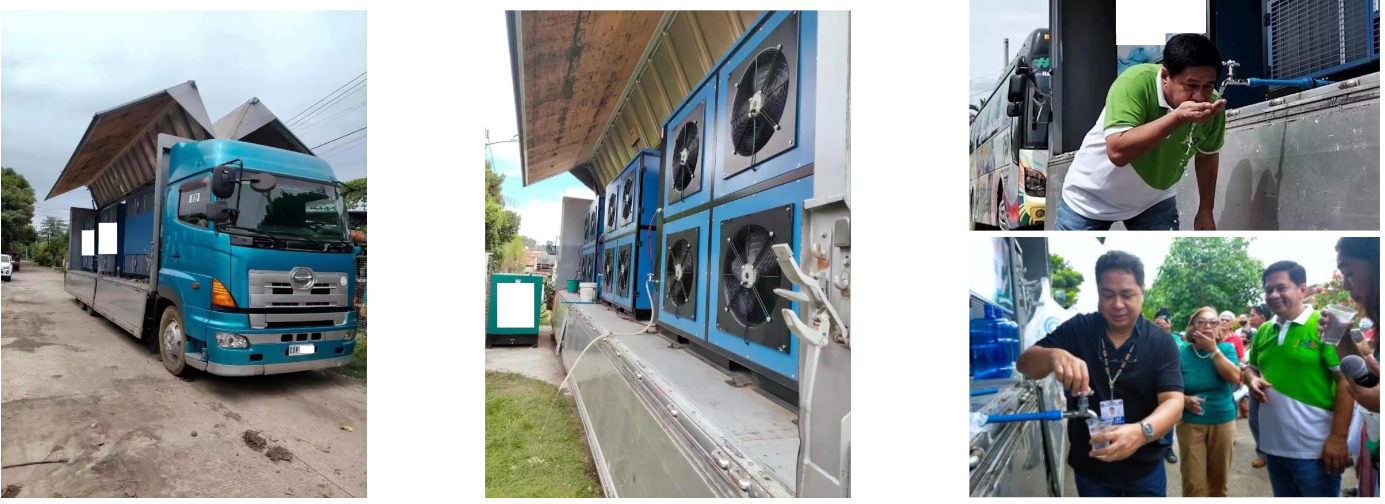 Application Scenario: used for local disaster-hit areas, aims to provide drinkable water to those affected people. Date of Deliver: April 2022. AWG: 3 units 2,000L/24Hrs @30°C, 80% RH. Benefits: AWGs produced 5,700L~6,600L water per 24Hrs under local high temperature and high humidity.