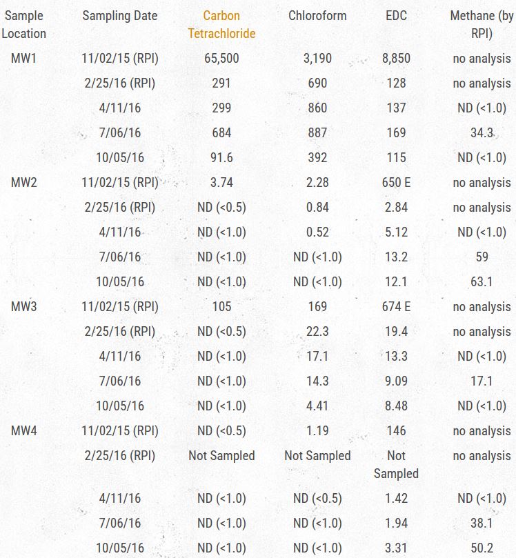 Three (3) post injection groundwater monitoring events have been completed from four (4) site monitoring wells. Contaminants of concern have shown significant decreases in concentration since in-situ treatment via injection of BOS100®. Further, there is specific evidence of continued contaminant degradation, based on dissolved methane detected in groundwater from monitoring wells MW2 and MW4.
