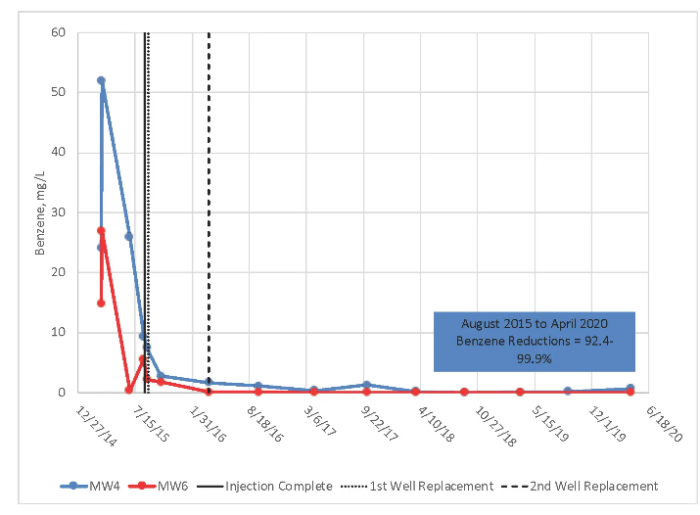 - Three monitoring wells within the remediation zone were demolished during the construction of the new parking lot. Due to site regrading, the first set of replacement wells were reinstalled about 6 months after the initial re-installation (Figure 2). Benzene concentrations in the replacement wells have been reduced 92.4-9-99.9% over the 4.5-year monitoring period.