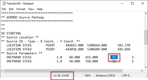 This is useful for identifying the location of errors within model files. For example, AERMOD always prints a line number in warning and error messages. The warning message below references line 38 as the location of a potential out-of-range source parameter (VS for exit velocity).