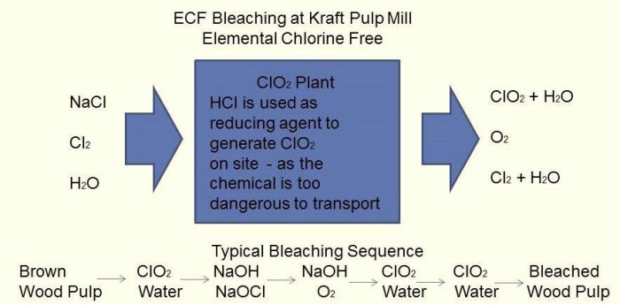 Elemental Chlorine Free - ECF - bleaching of wood pulp using Chlorine Dioxide, CIO2, as the primary bleaching agent eliminates dioxin emissions. This is a reflection of the fact that as a bleaching agent CIO2 is 10 times more reactive than elemental Chlorine, Ck. As a powerful oxidizing agent CIO2 must be generated on site - it is too dangerous to transport by either rail or highway. Approximately 90% of white papers today are made using ECF bleached wood pulp. And also any trace amount of CICMhat escapes either the CIO2 generator or the bleach plant at the kraft mill must be captured and scrubbed in a packed tower. At just 5 ppm concentration CIO2 if breathed is capable of causing serious lung damage.
