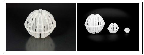 A typical CIO2 generator and kraft mill bleach sequence are shown above. Note that in addition to the generatorthat in the bleaching process that there are several places where fugitive emissions of CIO2 must be addressed-Typically, these emissions are captured and passed through a counter-current scrubbing tower. The packing of choice for the tower being 3.5" Jaeger Tri-Packs?1 in PVDF resin, seen left below,to resist the powerful oxidizing power of CIO2.