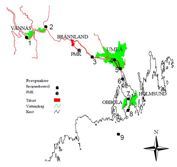 Semipermeable membrane devices were used in the search for a PCB point source in Umeå river, Sweden. Diffuse sources or discontinuous sources of pollution to rivers are difficult to study since the time of sampling is crucial. With semipermeable membrane devices (SPMD) a continuous sampling of dissolved concentrations of lipophilic compounds were performed during several weeks. Umeå river has been studied during several years searching for sources of lipophilic organic pollutants as PAH, PCB, organochlorine pesticides, hexachlorobenzene etc. The search started along a 50 km long part in the river and after few samplings ended up in the stormwater system, where one large source were identified. During the search it was found that the release to the river were strongly related to season and thus to climate changes. Since the release was at the shoreline, the distance of sampling from the shore were also important.