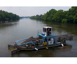 The 50-foot long, 13-foot-wide Aquarius Systems TH-34 Trash Skimmer vessel features twin catamaran hulls and a water jet propulsion system. The Trash Hunter® operates for 10 months out of the year removing floating debris and litter for the 10-mile stretch of the Passaic River.