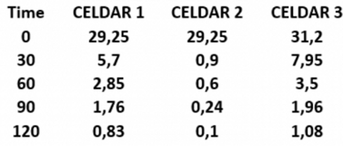 The cell configuration has been programmed with three different selective electrodes of our production which are shown in the graph as CELDAR 1 - 2 - 3 (first images).