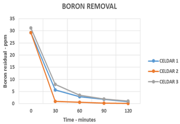 The removal of boron evaluated by sampling the times indicated is in the graph (first chart)
