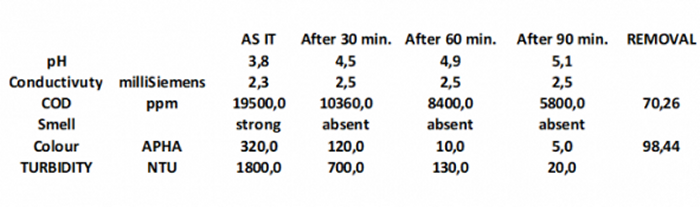 The customer asked us to evaluate the ELECTROCOAGULATION SYSTEM for the COD and smells removal to be able to drain the treated water into the sewer system.