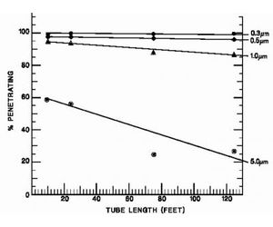 When a sample is taken for either certification or routine monitoring operations, it is not uncommon for the isokinetic sample probe (ISP) to be in a remote location from the particle counter optics. In this situation, the sample is drawn through tubing to the particle counter. When the sample is to be transported any significant distance in the tube from the point of sampling to the point of measurement, some particle losses will occur in the transport tubing. The losses are dependent on tubing type, flow velocity, tubing diameter and distance. Large particles are lost by a combination of gravitational settling to the bottom of the duct and inertial deposition on the walls of the tubing when directional changes occur. See below.