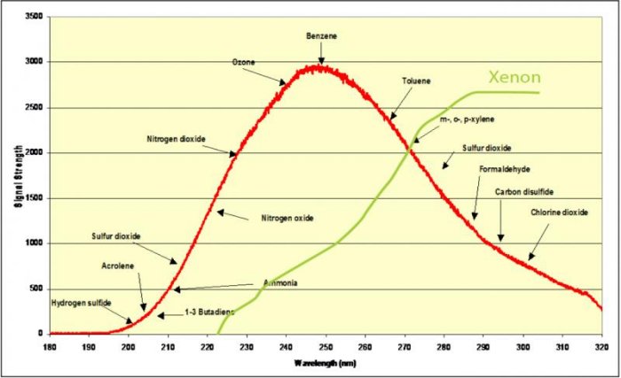 All gas compounds absorb UV light energy at specific wavelengths. UV DOAS analyzers detect gas compounds found present in a reflected UV light beam. For a gas compound to be detected by a UV DOAS analyzer, there must be enough UV energy present at the wavelength’s point of absorption.