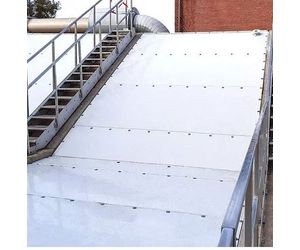 The particular challenge was that the chambers run upwards at an angle from around half their length, so the covers had to make a "kink" to follow this gradient. The rectangular panels were anchored to GRP brackets that were mounted on the edges of the basins, allowing a total area of 167 square meters to be covered.