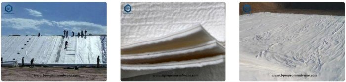 - Two layers geotextile and one layer membrane, weight of base geotextile is 80gsm – 600 gsm, thickness of geomembrane is 0.2mm-1.5mm.