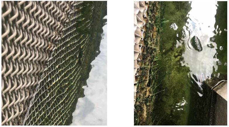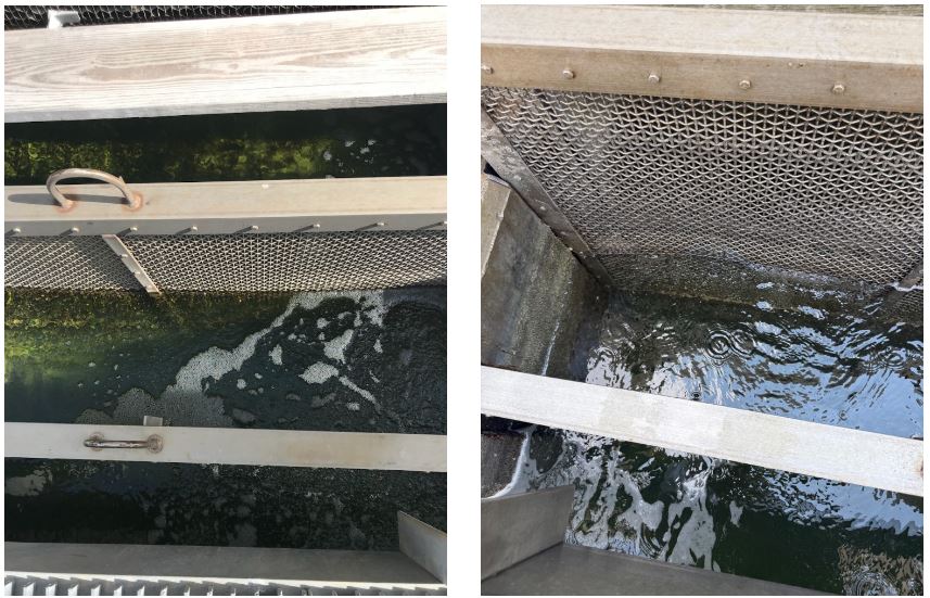 Fig 1 (left). View of the air intake and water basin. The slime shown was typical for the time of year. This photo was taken in September 2019.