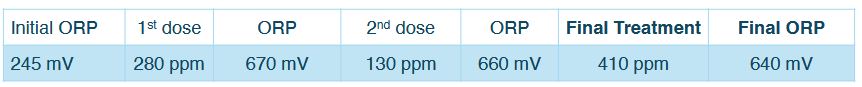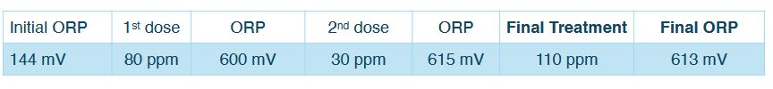 Notes: The treatment aimed to increase the initial ORP to a minimum target of>+600 mV.A measurement taken five minutes after the first 280 ppm dose of mineral oxychloride AOP showed the ORP had reached 670 mV.A second reading was taken 30 minutes later, after the oxidative energy in the system had stabilized. Because the ORP had dropped significantly, a second dose was administered to reach the target level. Five minutes later the ORP had increased to 660 mV. The technician returned about 20 minutes later to record the final stabilized reading of640mV.